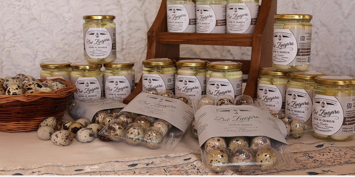 Uova di quaglia lessate, sgusciate e confezionate in barattoli con soluzione composta da aceto balsamico e sale.