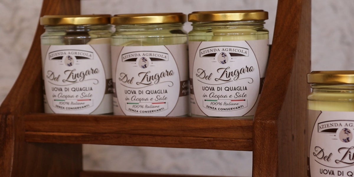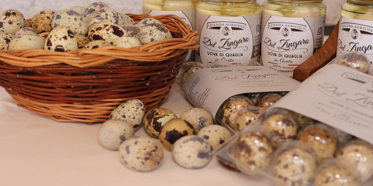 Uova di quaglia lessate, sgusciate e confezionate in barattoli con soluzione composta da aceto di mele, vino bianco e sale.